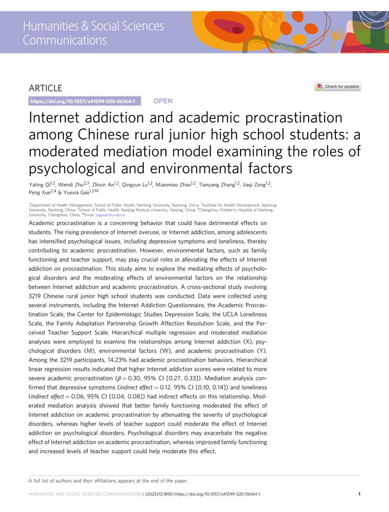 近日,南通大学公共卫生学院高月霞教授团队在Nature旗下人文社会科学领域的权威期刊《Humanities & Social Sciences Communications》(中科院大类二区,影响因子3.60)发表重要研究成果。该论文以“Internet addiction and academic procrastination among Chinese rural junior high school students:A moderated mediation model examining the roles of psychological and environmental fa