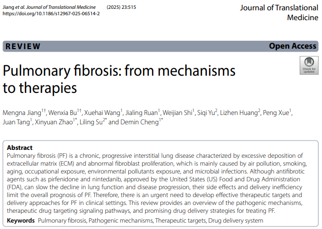 相关成果以“Pulmonary fibrosis: from mechanisms to therapies”为题,发表在《Journal of Translational Medicine》(IF: 7.2, 中科院医学二区)上。