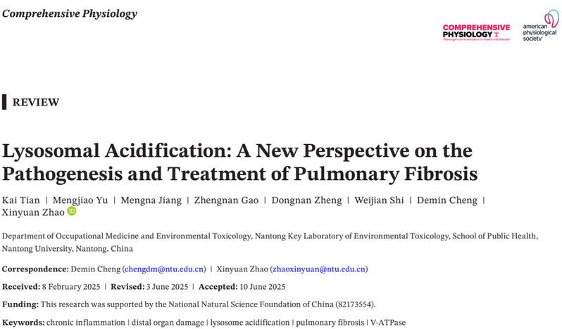 相关成果以“Lysosomal acidification: a new perspective on the pathogenesis and treatment of pulmonary fibrosis”为题,发表在《Comprehensive Physiology》(IF: 5.2, 中科院生理学一区)上。