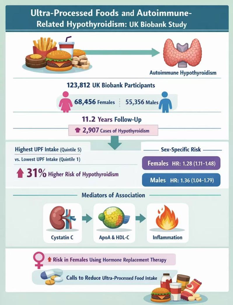 该研究题为“Ultra-processed food consumption and incident autoimmune-related hypothyroidism: A sex-stratified prospective analysis from the UK Biobank”,基于英国生物银行大规模前瞻性队列数据展开分析。研究共纳入123,812名基线无甲状腺疾病的成年人,研究团队依据NOVA食品加工分类体系,计算超加工食品摄入占总能量比例。在中位随访11.2年期间,共记录2,907例新发自身免疫相关甲状腺功能减退症病例。结果显示,与超加工食品摄入最低五分位相比,最高五分位人群的发病风险显著增加了31%。进一步的中介分析显示,多种生物标志物在超加工食品与甲减风险之间发挥部分中介作用。其中,反映肾功能的胱抑素C解释了最大比例的关联效应,其次为与胆固醇外排功能相关的ApoA和HDL-C。研究提示,超加工食品可能通过代谢异常、肾功能损害以及慢性炎症通路,促进自身免疫性甲状腺疾病的发生。分层分析进一步发现,在女性人群中,使用激素替代治疗者的风险关联更为显著,提示性激素状态可能与超加工食品诱导的免疫与代谢紊乱产生协同效应,为女性特异性饮食干预提供了重要科学依据。