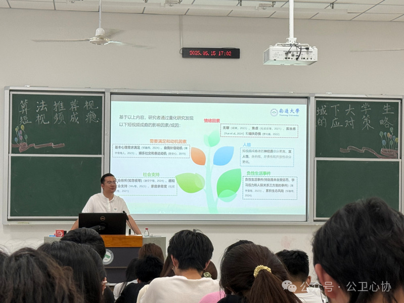 为引导大学生正确认识短视频成瘾问题,合理使用短视频平台,2025年5月15日下午,南通大学公共卫生学院心理协会于24号楼B106举办了一场聚焦“算法推荐视域下大学生短视频成瘾的应对策略”的专题讲座。